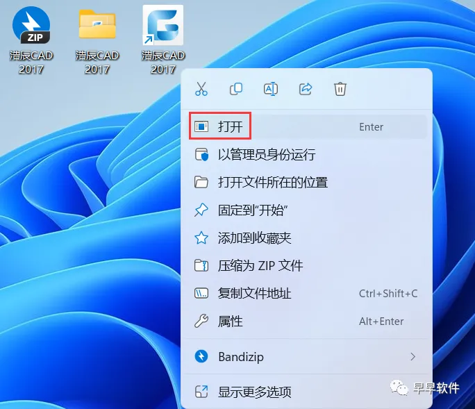 14、回到桌面,右键桌面上的【浩辰CAD 2017软件图标】,点击【打开】;注意:软件打开显示试用366天,实际可以无限制循环使用