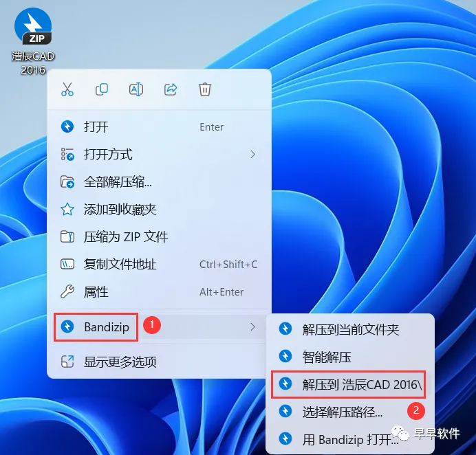 1、下载浩辰CAD 2016软件安装包到电脑上,右键选择【解压到浩辰CAD 2016\】