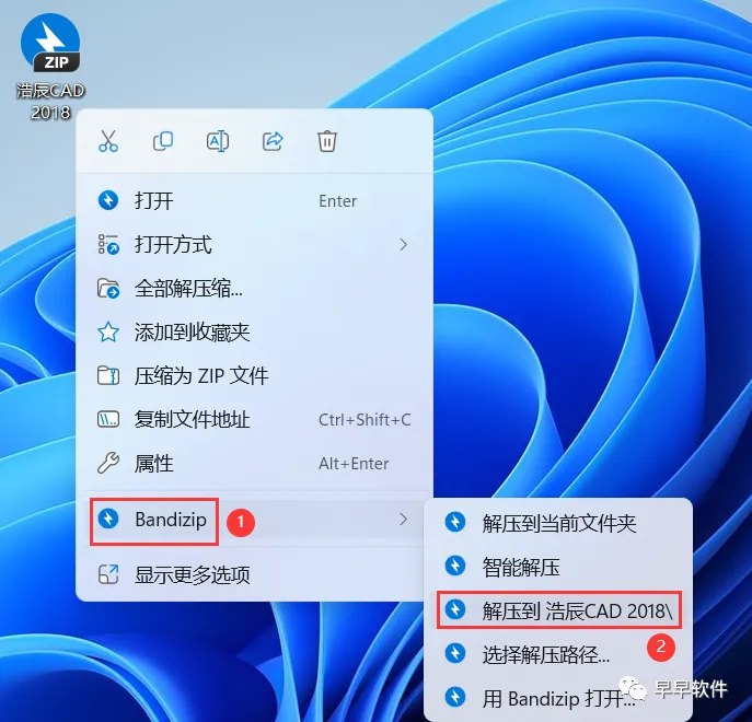 1、下载浩辰CAD 2018软件安装包到电脑上,右键选择【解压到浩辰CAD 2018\】