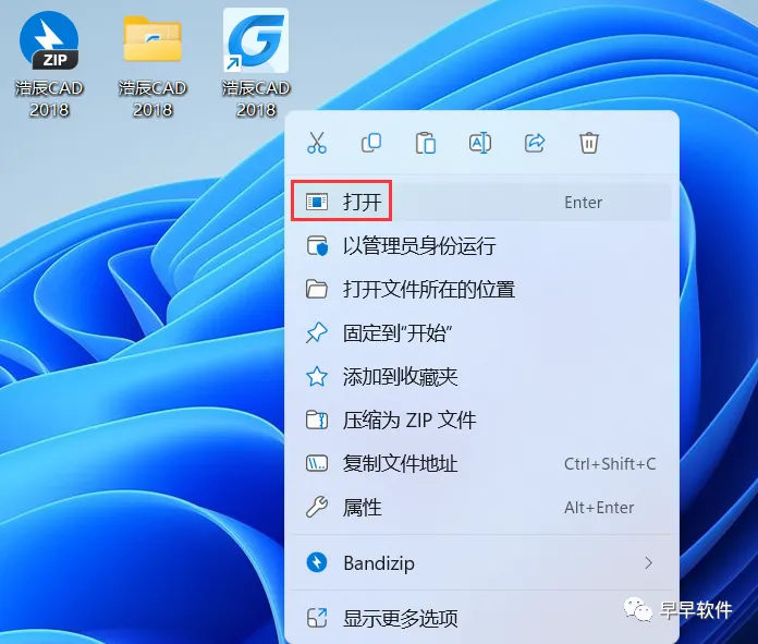 12、回到桌面,右键桌面上的【浩辰CAD 2018软件图标】,点击【打开】;注意:软件打开显示试用366天,实际可以无限制循环使用