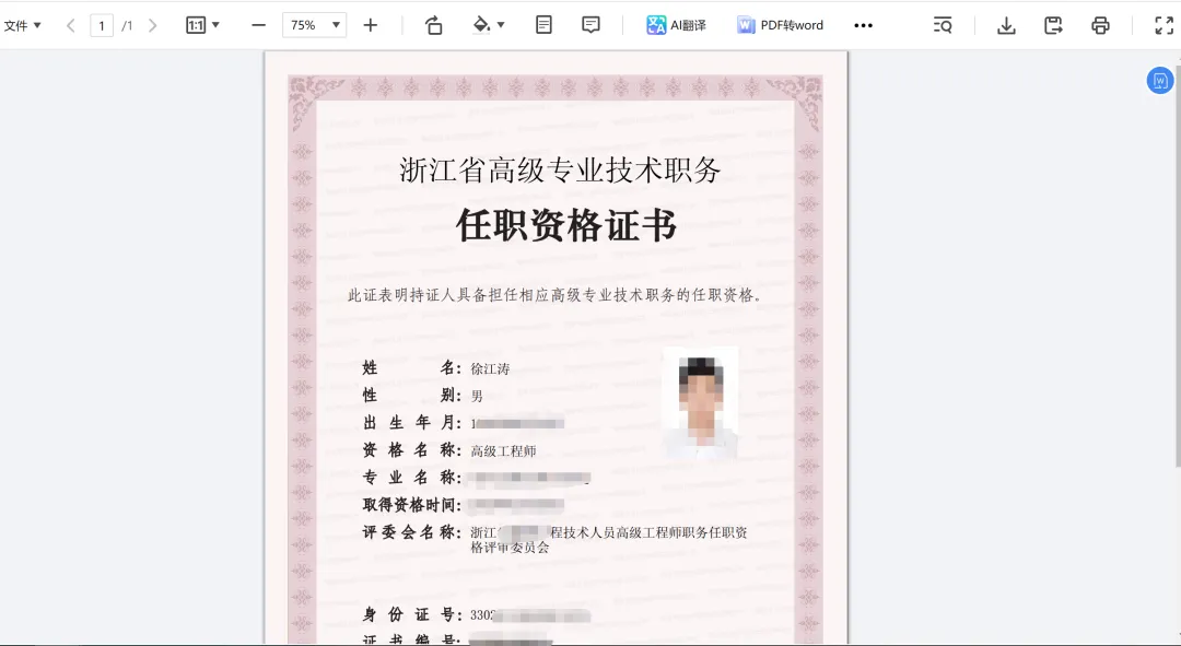 第六步(如下图所示,网页已显示职称证书,点击“下载文件”即可)