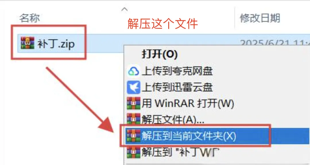 2、选中文件:补丁.zip,鼠标右键选择:解压到当前文件夹