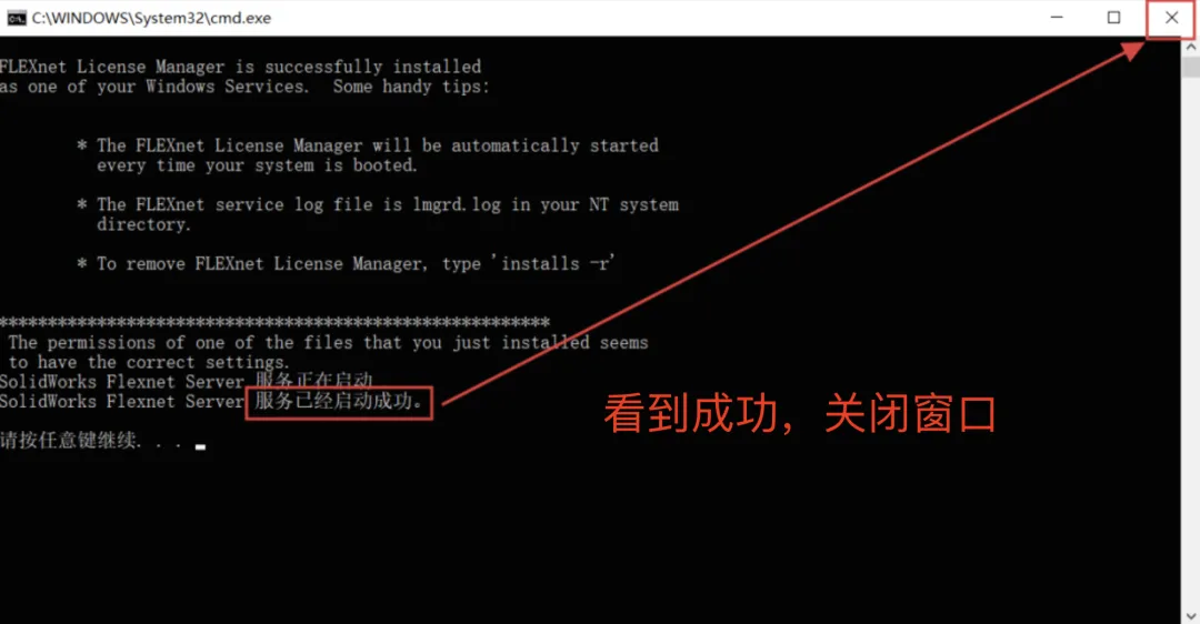 9、耐心等待一会儿,显示:服务已经启动成功,后关闭窗口