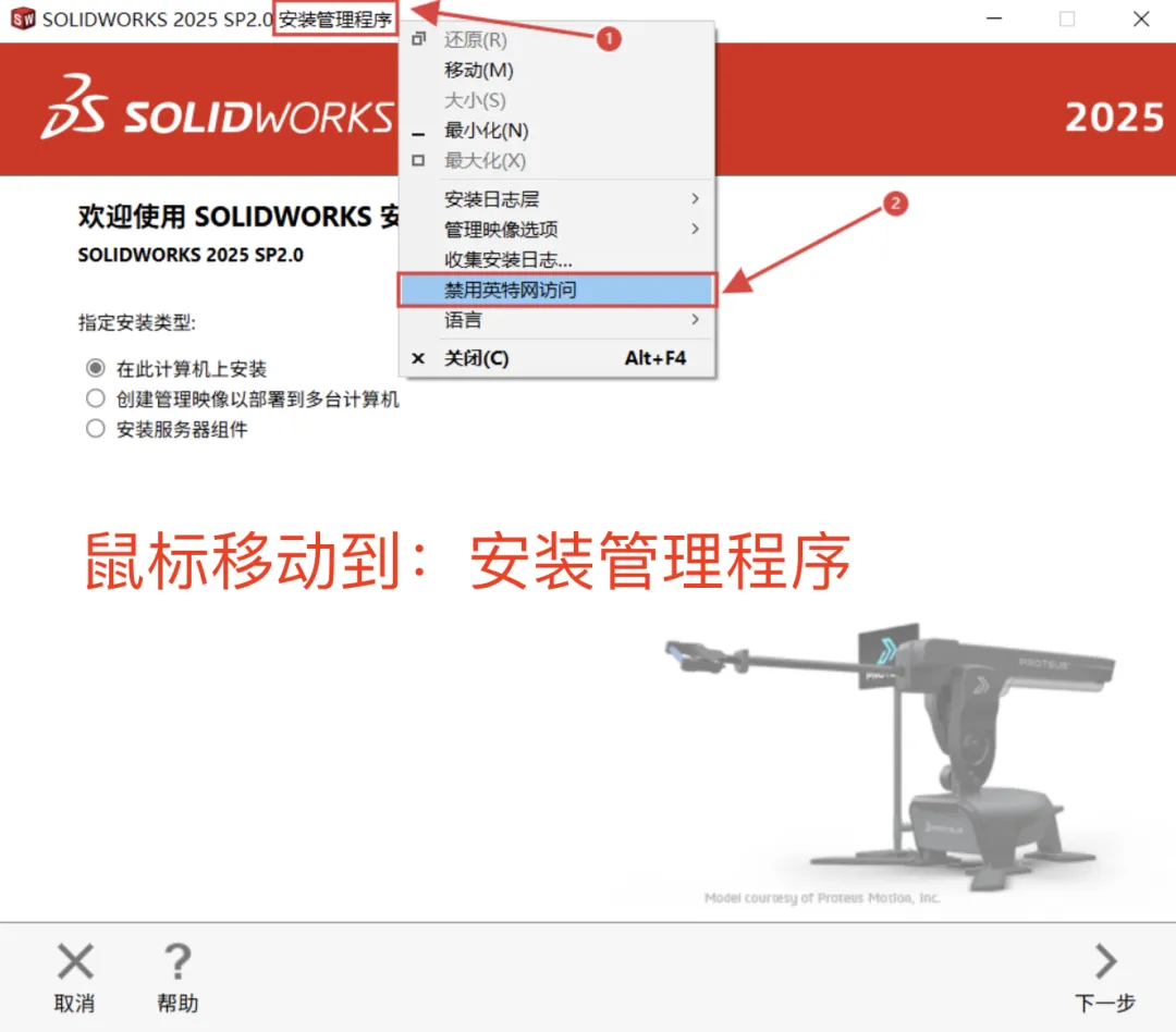 12、在安装界面,右键点击:安装管理程序(鼠标移动到上面),选择:禁用英特网访问