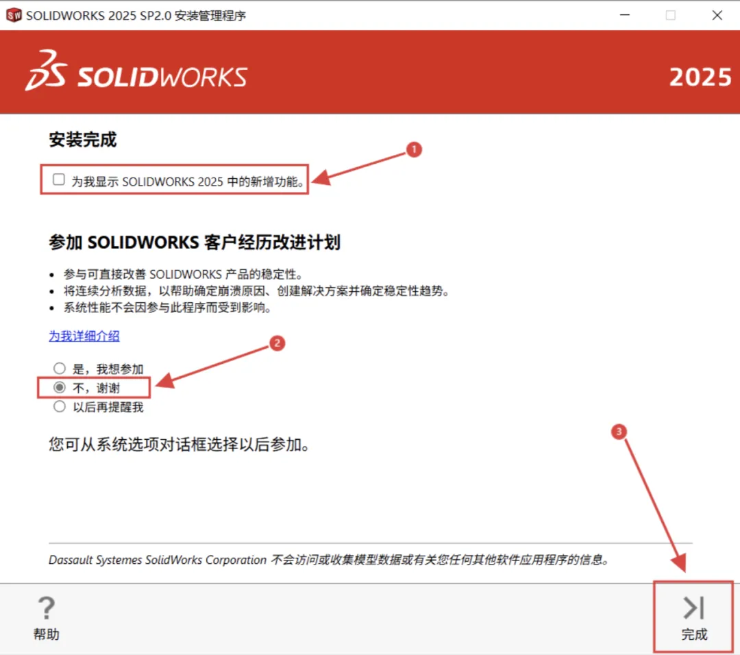24、安装完成,先取消勾选【为我显示SOLIDWORKS 2025...】,再选择【不,谢谢】,最后再点击【完成】