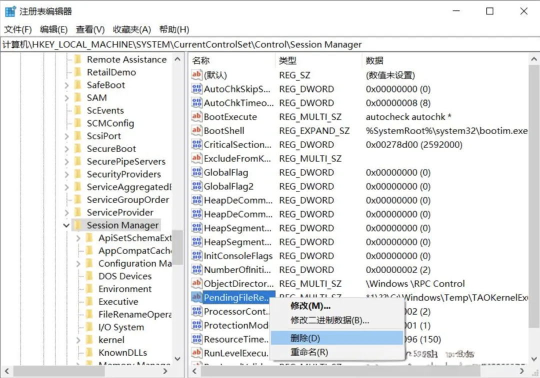依次展开 HKEY_LOCAL_MACHINE\SYSTEM\CurrentControlSet\Control\Session Manager,删除 PendingFileRenameOperations。