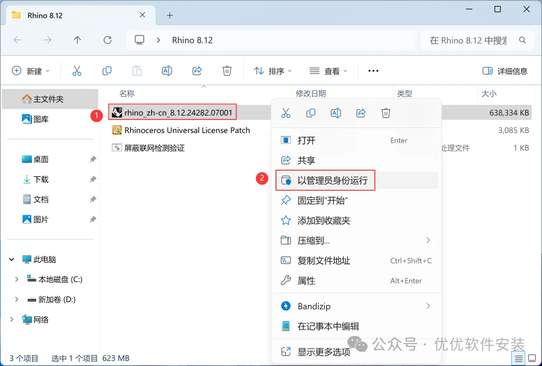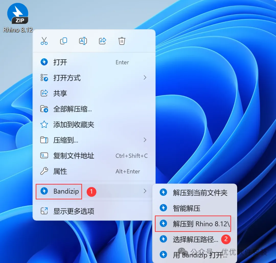1、下载Rhino 8.12软件安装包到电脑上,右键选择【解压到Rhino 8.12\】