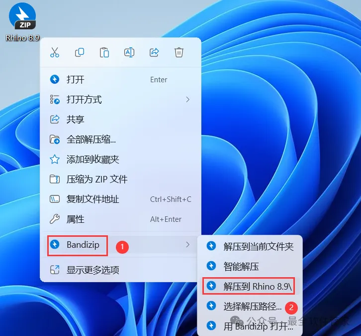1、下载Rhino 8.9软件安装包到电脑上,右键选择【解压到Rhino 8.9\】