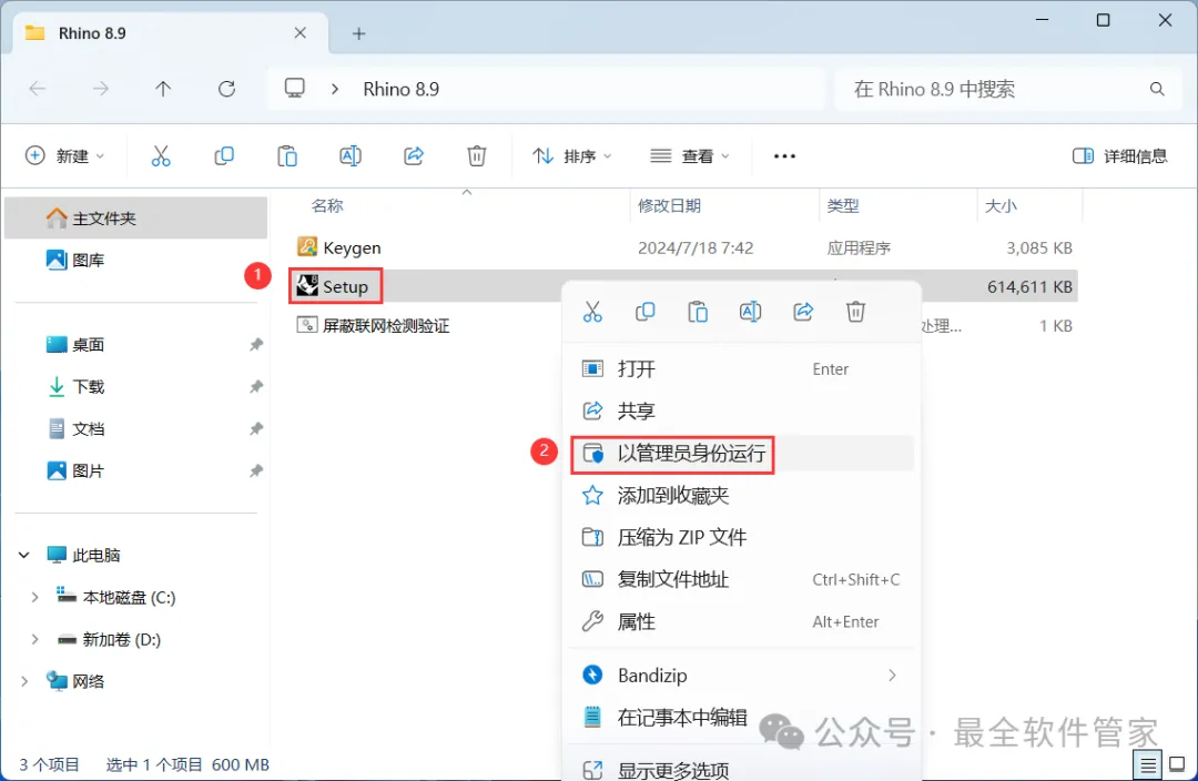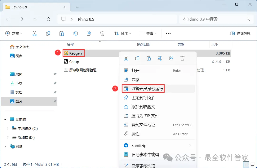 10、回到Rhino 8.9文件夹,找到【Keygen】程序,右键选择【以管理员身份运行】它