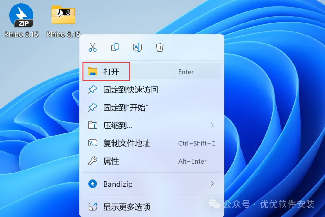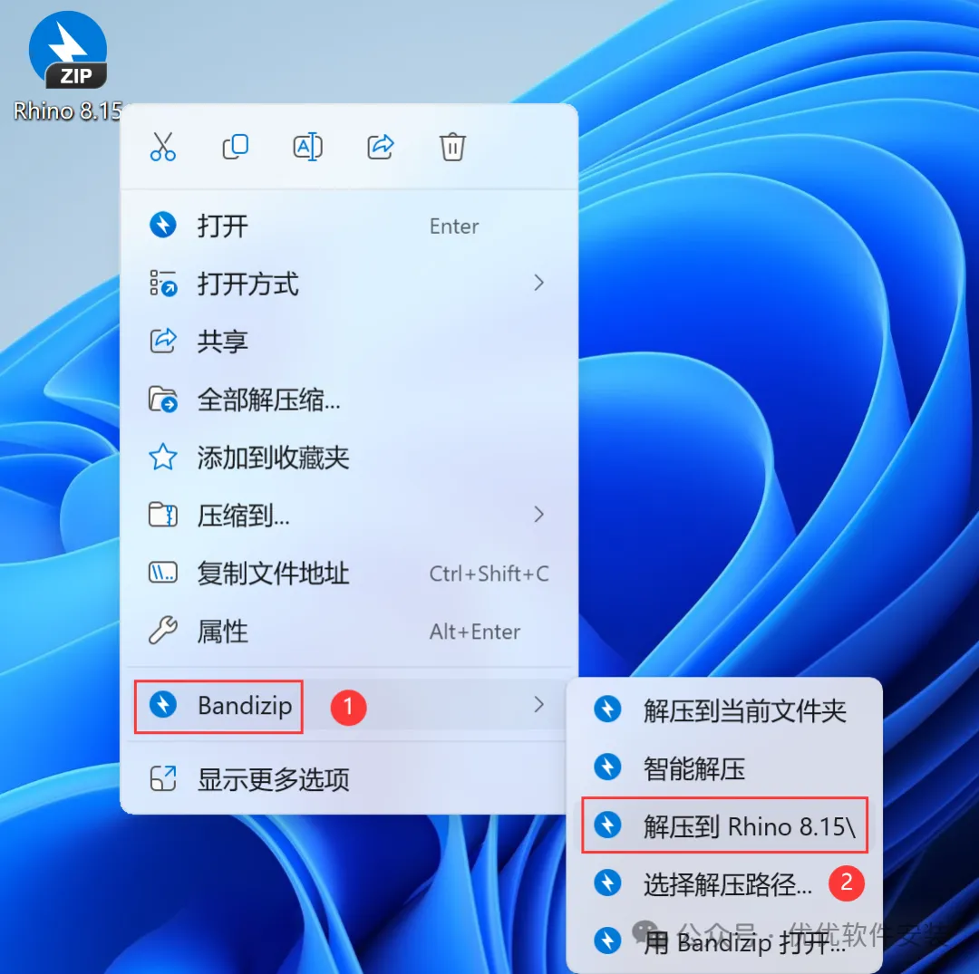 1、下载Rhino 8.15软件安装包到电脑上,右键选择【解压到Rhino 8.15\】