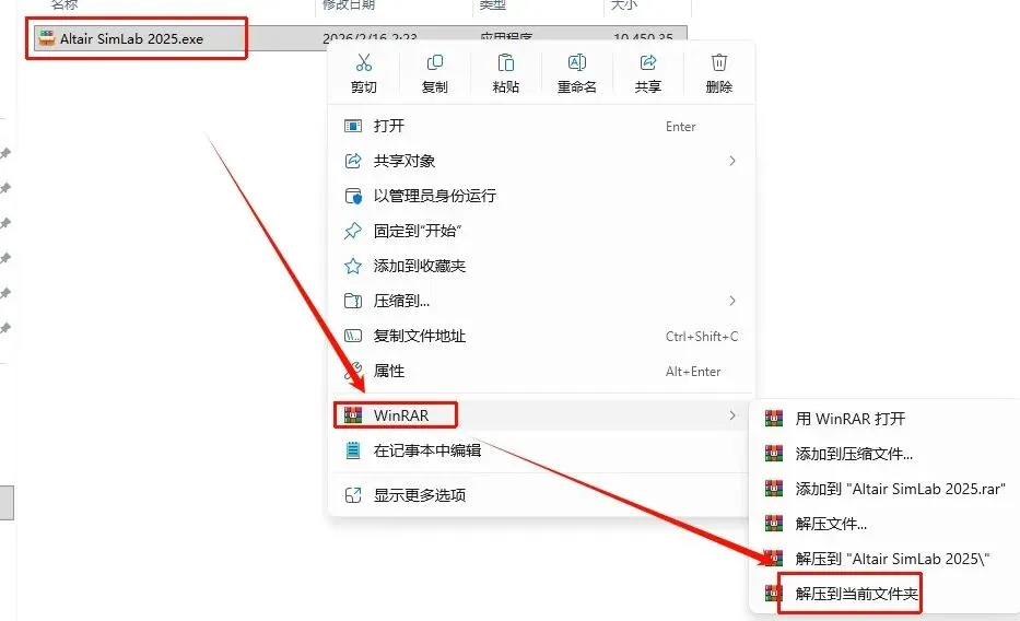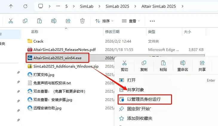 7.返回解压的“Altair SimLab2025“文件夹,鼠标右键点击“AltairSimLab2025_win64.exe”选择“以管理员身份运行”