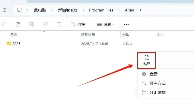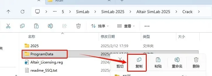 21.返回之前解压的“Altair SimLab 2025“文件夹,打开“Crack”文件夹,选中“2025“文件夹,鼠标右键选择“复制”
