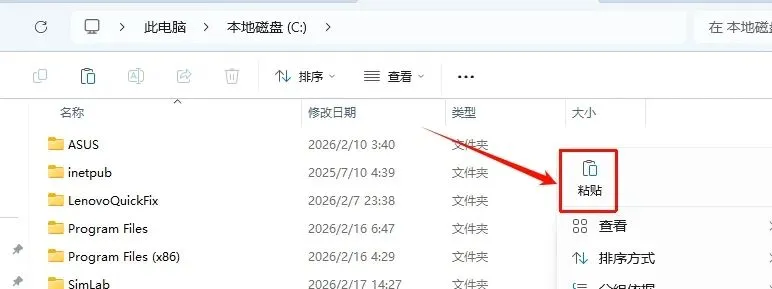 6.打开桌面“此电脑”,打开C盘根目录,粘贴刚刚复制的文件