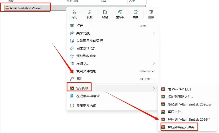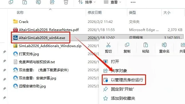 7.返回解压的“Altair SimLab2026“文件夹,鼠标右键点击“AltairSimLab2026_win64.exe”选择“以管理员身份运行”