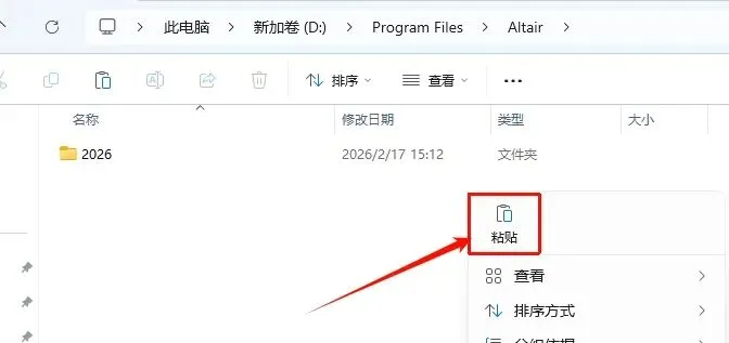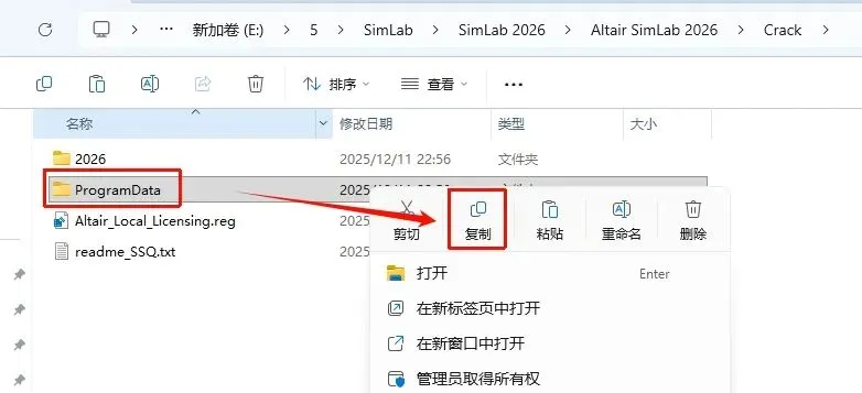 21.返回之前解压的“Altair SimLab 2026“文件夹,打开“Crack”文件夹,选中“2026“文件夹,鼠标右键选择“复制”