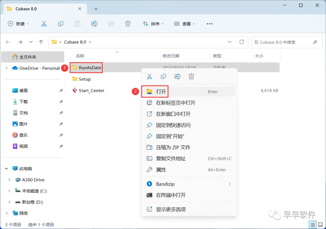 12、回到Cubase 8.0文件夹,找到【RunAsDate】文件夹,右键【打开】它