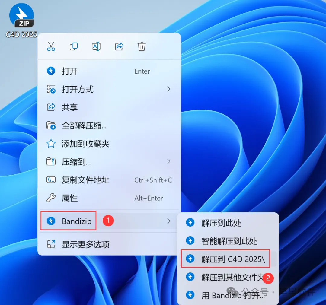 1、下载C4D 2025软件安装包到电脑上,右键选择【解压到C4D 2025\】