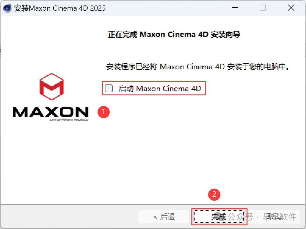 8、不勾选【启动C4D】,再点击【完成】