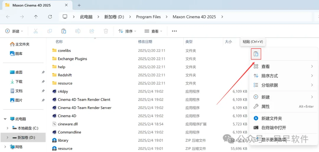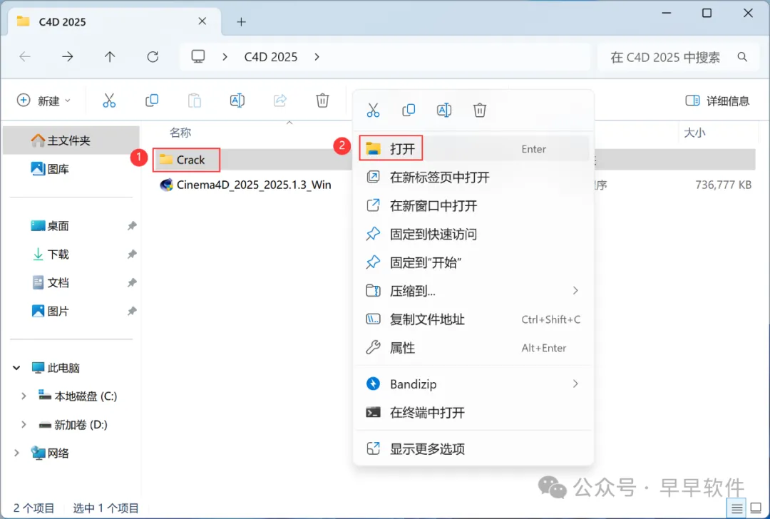 9、回到C4D 2025文件夹,找到【Crack】文件夹,右键【打开】它