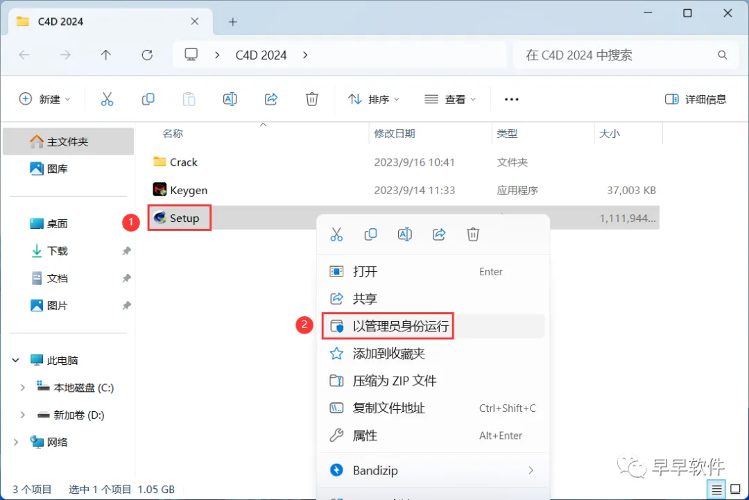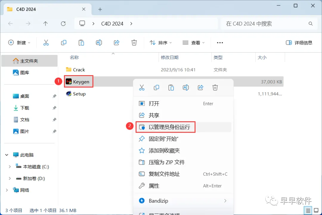 15、回到C4D 2024文件夹,找到【Keygen】程序,右键选择【以管理员身份运行】它