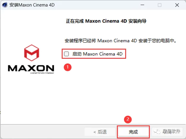 8、不勾选【启动Maxon Cinema 4D】,再点击【完成】