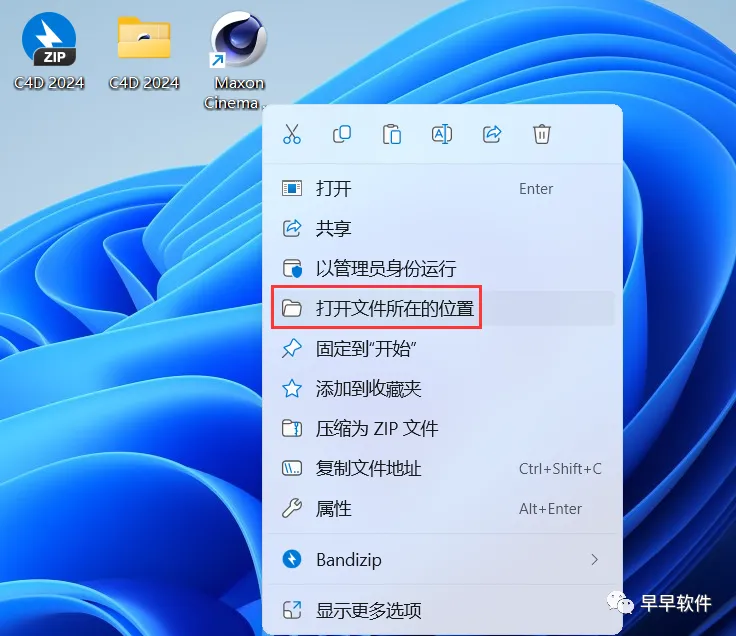 12、回到桌面,右键桌面上的【Maxon Cinema 4D 2024软件图标】,点击【打开文件所在的位置】