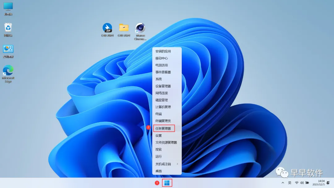 20、回到桌面,右键任务栏的【开始菜单】,点击【任务管理器】