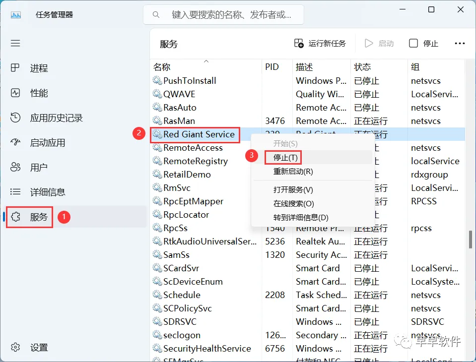 26、回到任务管理器界面,找到【Red Giant Service】,右键它点击【开始】