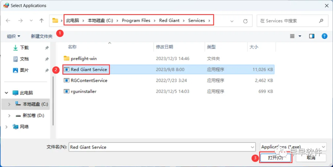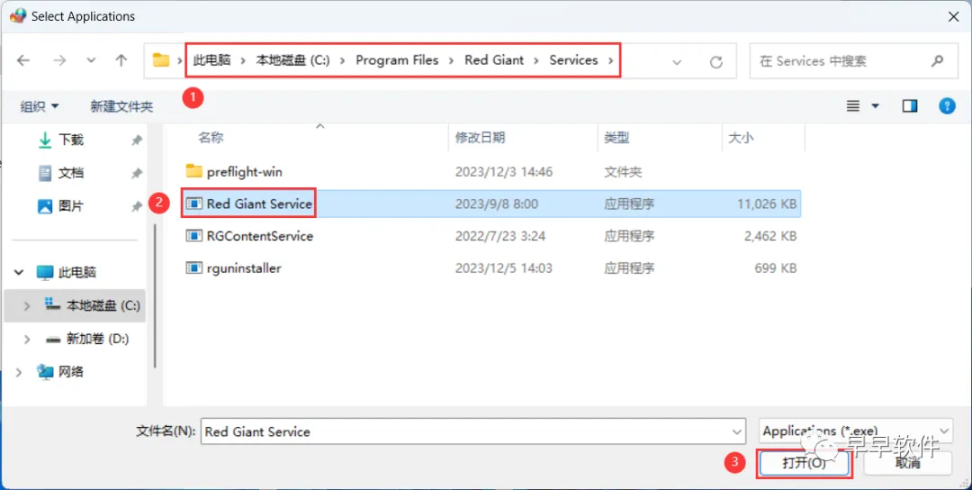 29、选择路径C:\Program Files\ Red Giant\ Service下的【Red Giant Service】程序,再点击【打开】