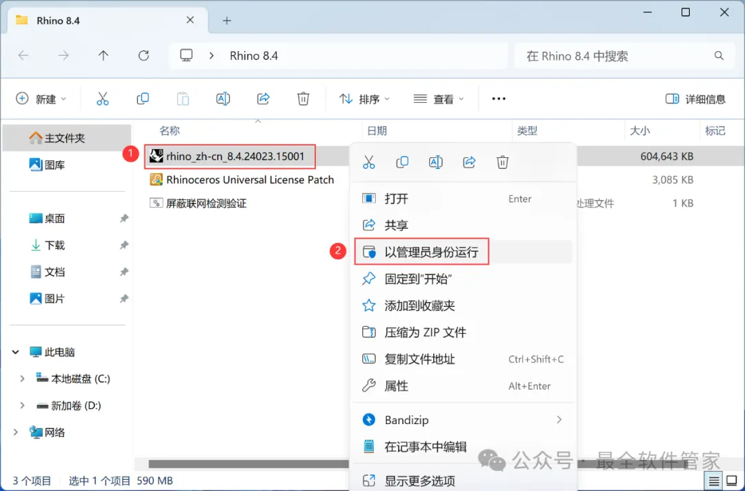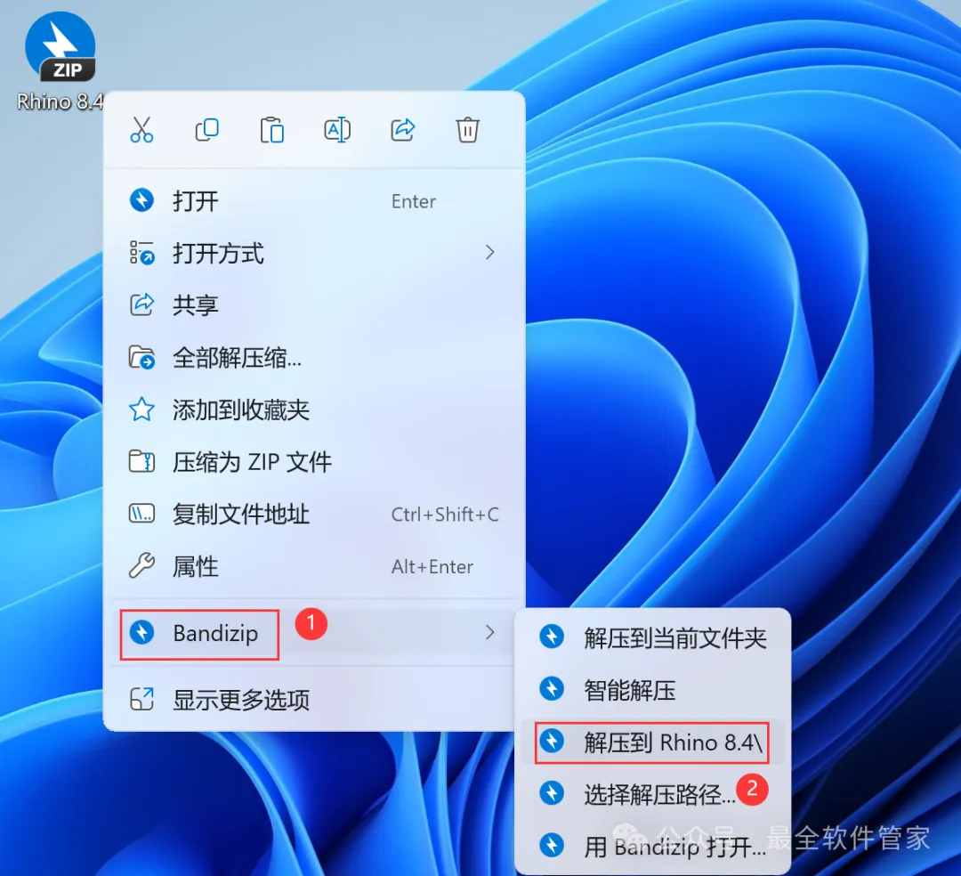 1、下载Rhino 8.4软件安装包到电脑上,右键选择【解压到Rhino 8.4\】