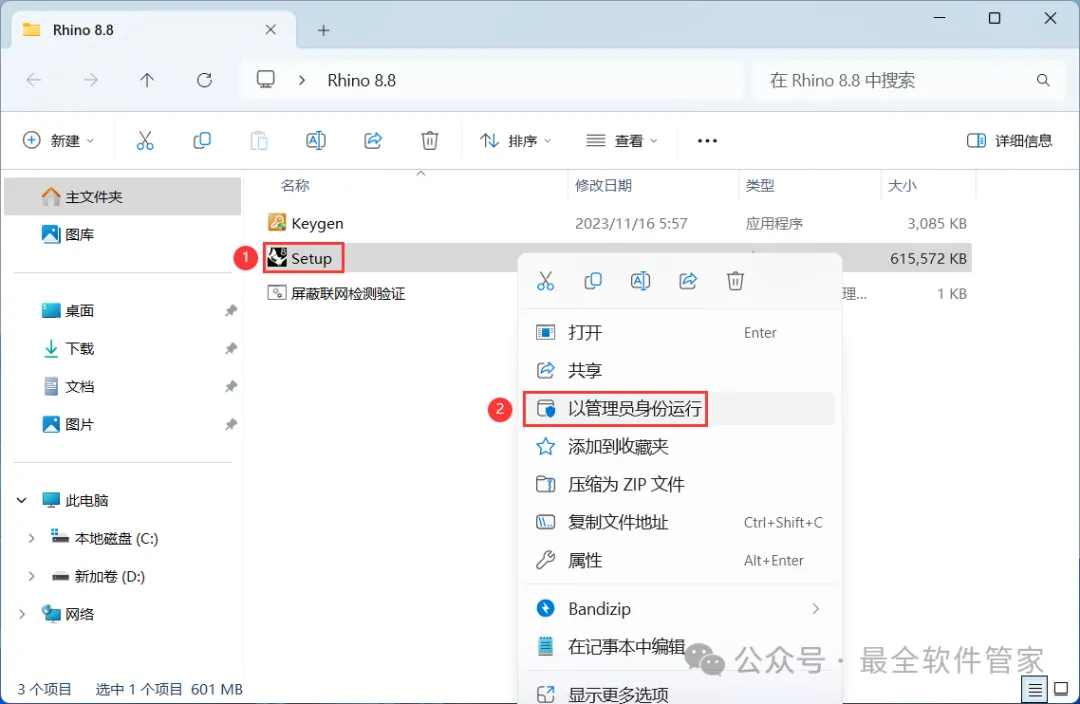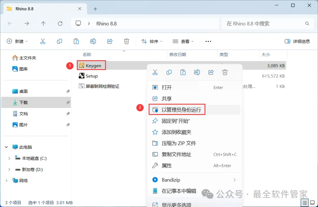 10、回到Rhino 8.8文件夹,找到【Keygen】程序,右键选择【以管理员身份运行】它
