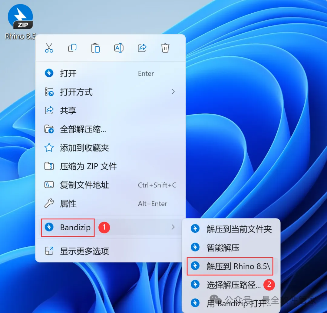 1、下载Rhino 8.5软件安装包到电脑上,右键选择【解压到Rhino 8.5\】