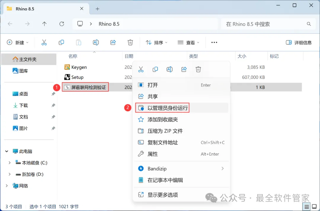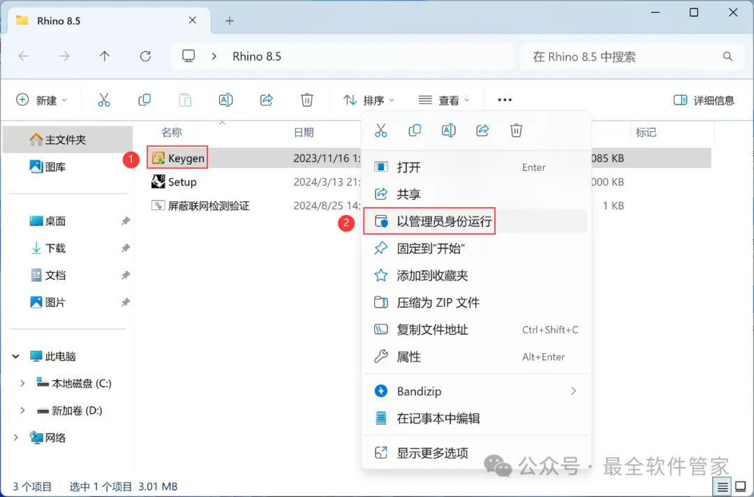 10、回到Rhino 8.5文件夹,找到【Keygen】程序,右键选择【以管理员身份运行】它