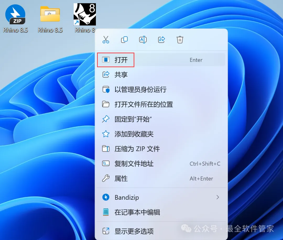14、回到桌面,右键桌面上的【Rhino 8软件图标】,点击【打开】