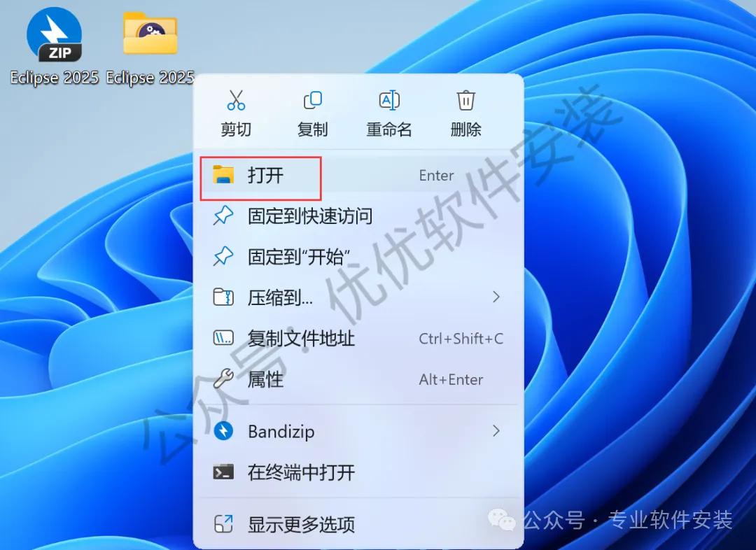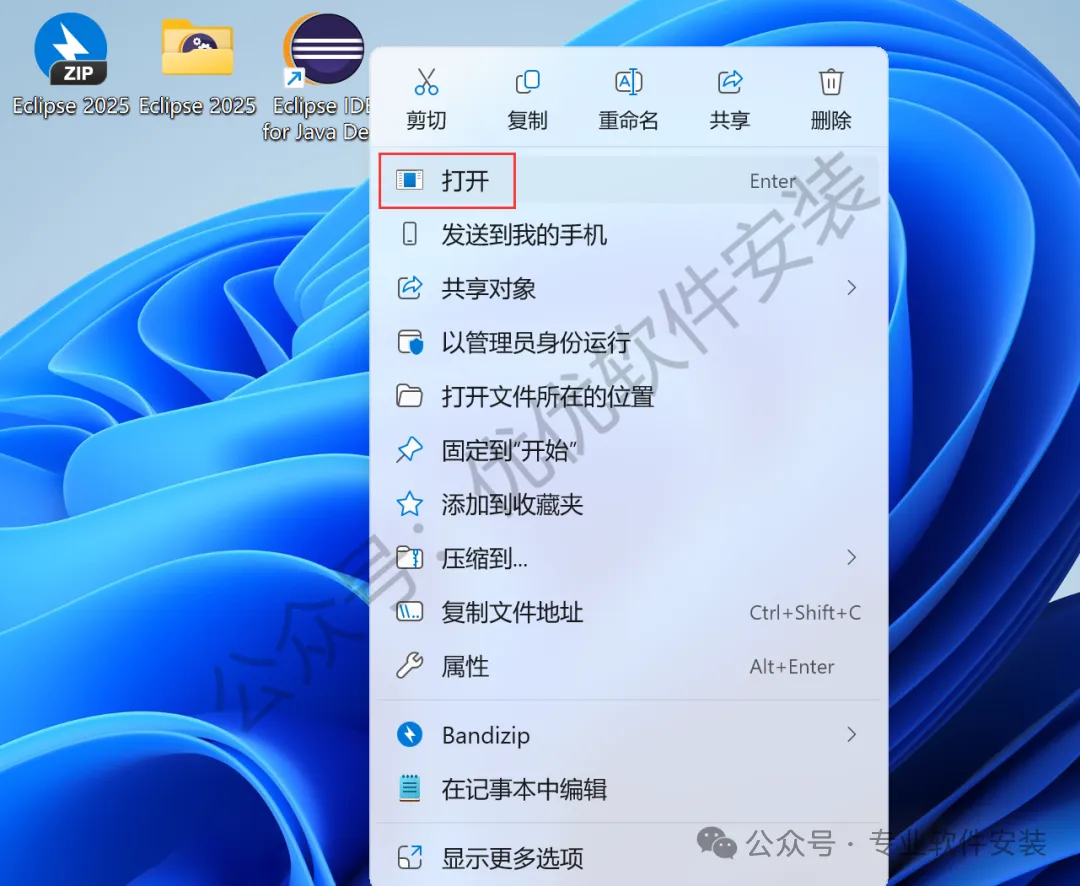 28、回到桌面,右键桌面上的【Eclipse 2025软件图标】,点击【打开】