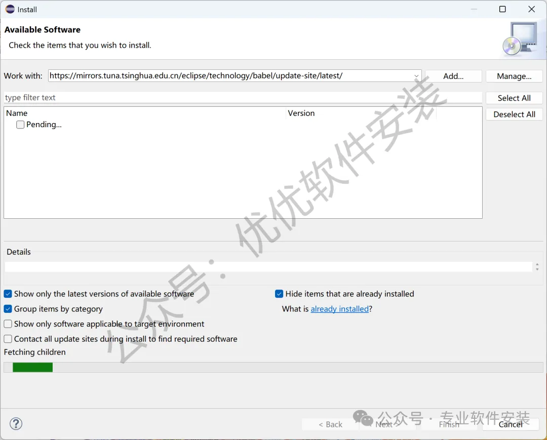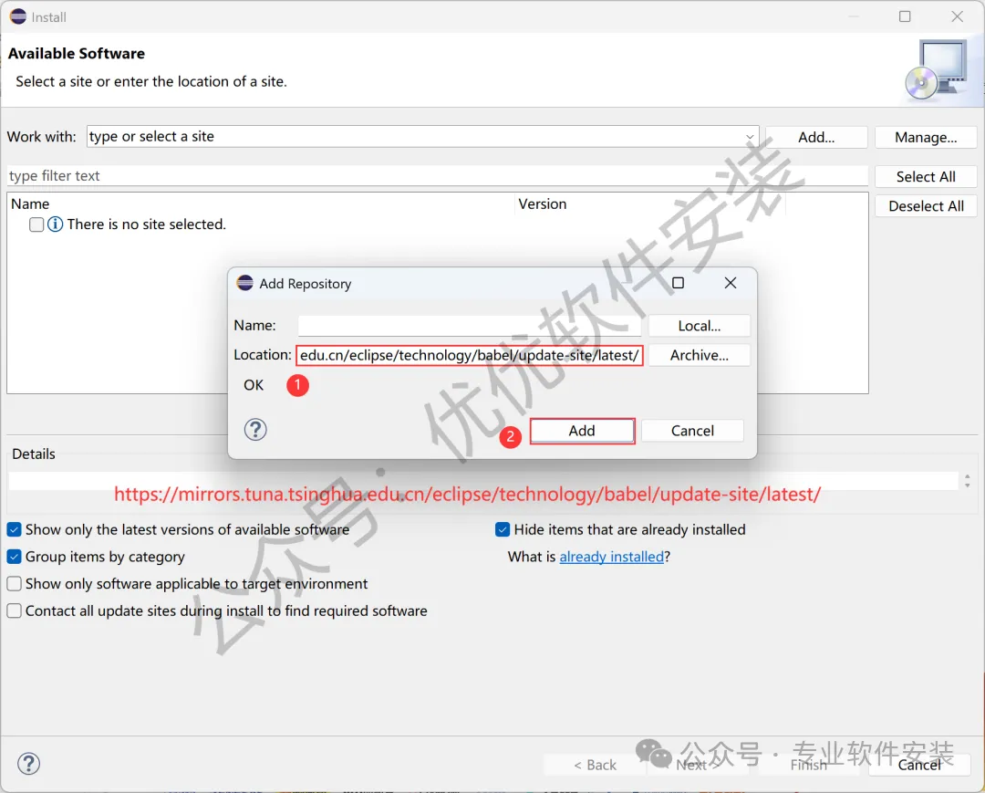 18、Location输入:https://mirrors.tuna.tsinghua.edu.cn/eclipse/technology/babel/update-site/latest/,再点击【Add】