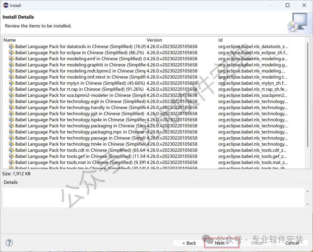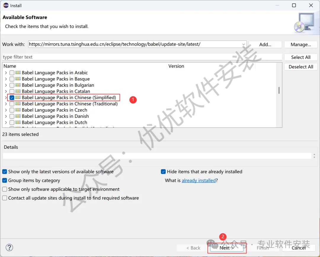 20、勾选【Babel…Chinese(Simplified)】,再点击【Next】