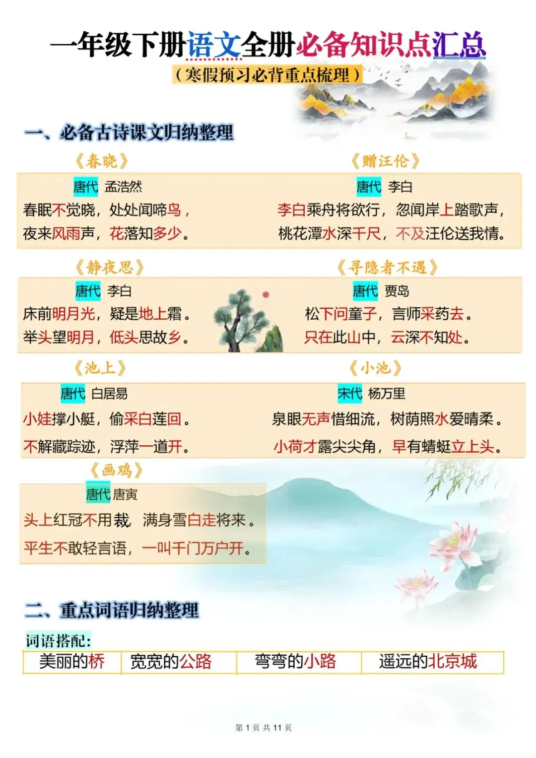 一年级(下)语文 全册知识点汇总