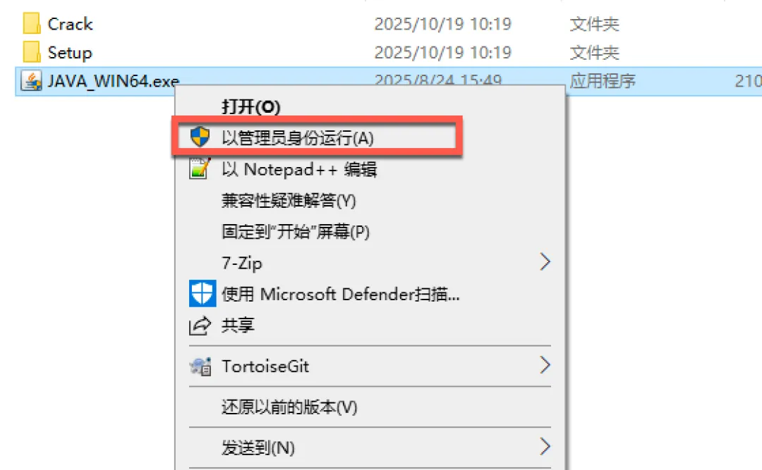 1、下载的压缩包解压。我们先安装 JAVA_WIN64 程序,鼠标右键选择【以管理员身份运行】