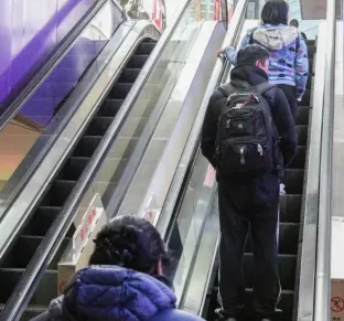 A. 商场的地面B. 乘坐的电梯C. 悬挂的展牌D. 架上的商品