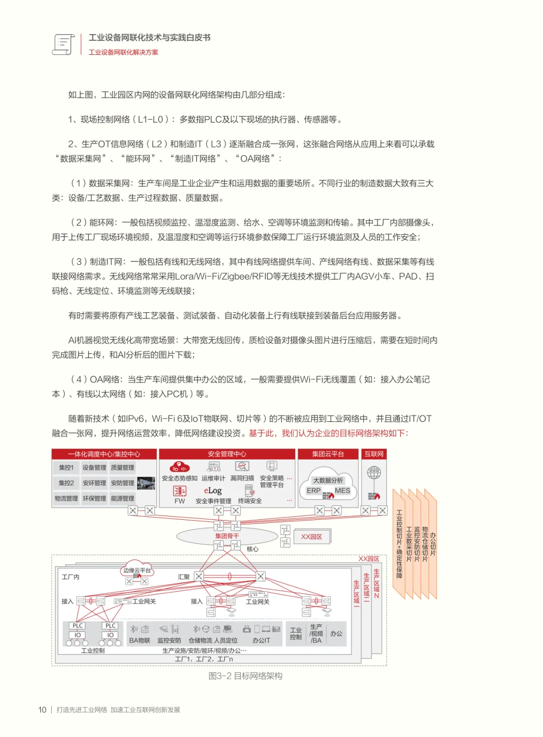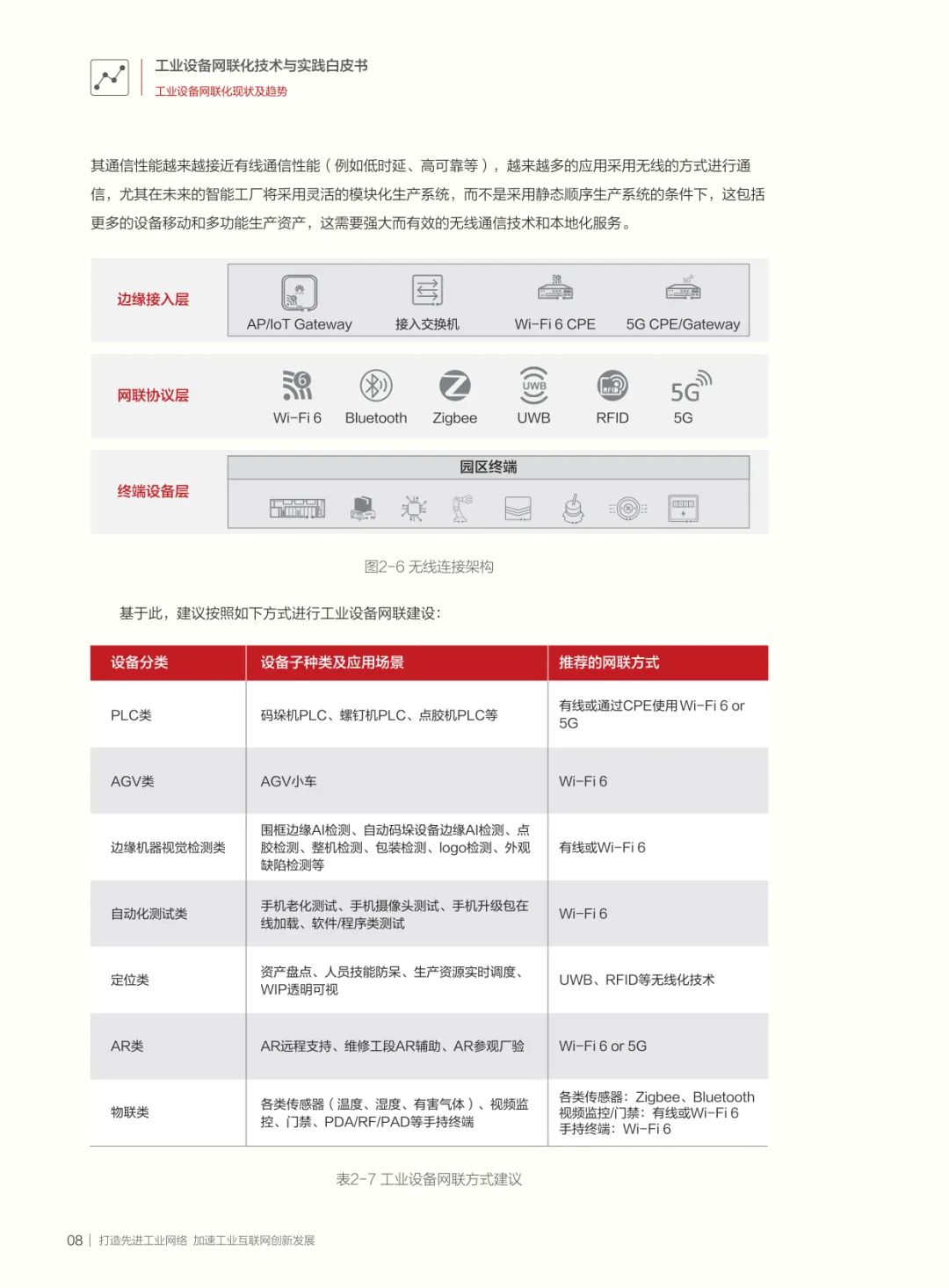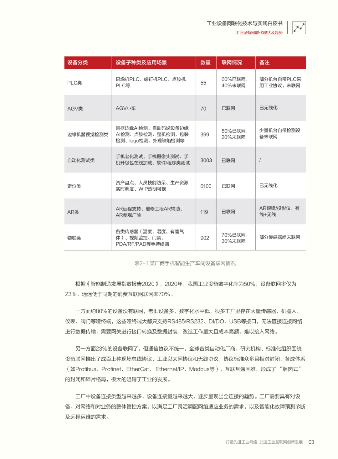 随后,白皮书深入呈现工业设备网联化现状与趋势:现状层面,以某手机智能车间为例,揭示我国工业设备数字化率仅50%、联网率23%(远低于消费互联网70%)的现实困境——80%设备未联网(多为仅支持RS485/RS232等接口的“哑终端”,改造工作量大)、23%已联网设备因协议不统一(Profibus、Profinet等成百上千种封闭协议)形成“烟囱式”格局,阻碍互联互通;趋势层面,业务数字化云化、设备效率质量提升、柔性产线需求驱动三大路线,推动技术协议从总线→以太→IP化、IT/OT从分离→融合、连接方式从有线→无线(5G、Wi-Fi 6等解决有线部署维护痛点),并给出不同设备的网联方式建议(如PLC类用有线或Wi-Fi 6/5G、AGV用Wi-Fi 6、定位类用UWB/RFID)。