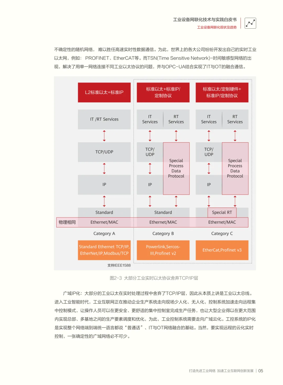 最后,白皮书展望未来:工业智能时代将形成网状数据交互架构,OT与IT融合成为转型关键;先进工业网络以“设备网联化、联接IP化、网络智能化”为特征,追求开放标准统一的全栈融合框架——设备网联化需结合5G/Wi-Fi 6等技术升级或叠加新网络,联接IP化将推动工业协议统一(预计2030年IP化比例超70%),网络智能化需实现自治运维与确定性体验保障。新一代先进工业网络将构筑工业体系“路网系统”,为工业经济高质量发展奠定坚实基础。