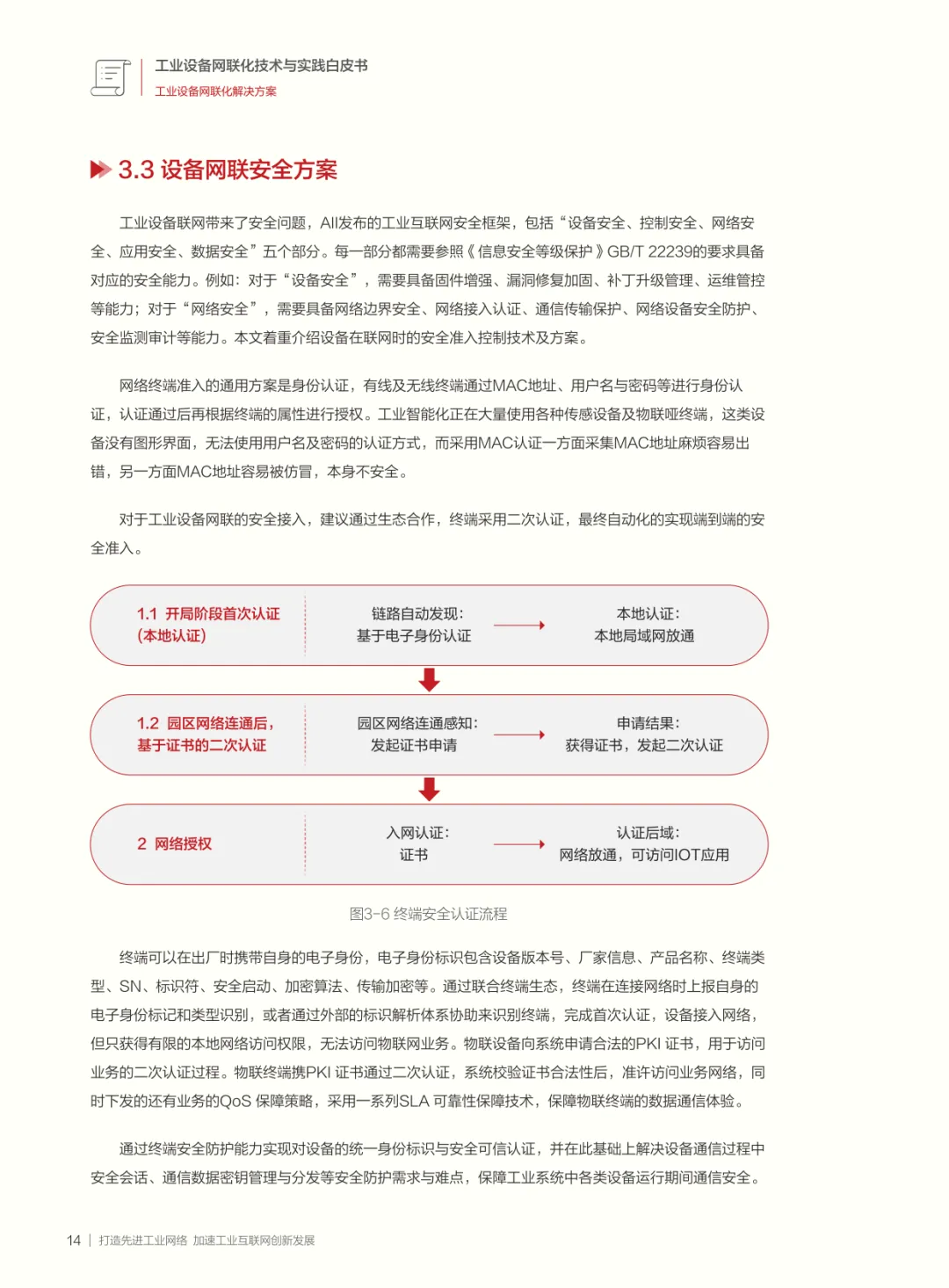 针对现状痛点,白皮书提出系统性解决方案:目标网络架构需整合现场控制网络(L1-L0)、融合OT与IT的生产信息网络(L2-L3),并引入IPv6、Wi-Fi 6、IoT等技术构建“一体化调度中心+安全管理中心+集团云平台+园区多场景网络”的一体化架构;设备数采方案覆盖手动采集(适用非自动工位但准确性受限)、非侵入式改造(外挂传感器适用于老旧设备但误差大)、接口转换网关(适配RS232/RS485等设备)、边缘协议网关(含协议转换与断线缓存)、设备自动采集(网卡或PLC输出,实时性强)五大类,匹配不同设备的数据获取需求;安全方案则围绕工业互联网安全框架的“设备、控制、网络、应用、数据”五维要求,重点设计终端二次认证流程——出厂电子身份首次认证获有限权限,再通过PKI证书二次认证访问业务网络,配套QoS保障与通信安全,解决工业哑终端无界面、MAC认证不安全等问题。