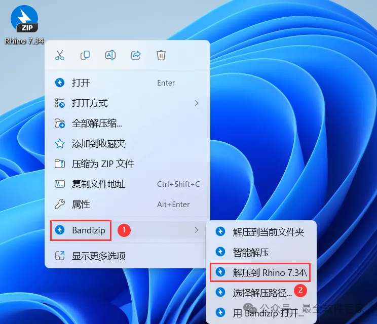 1、下载Rhino 7.34软件安装包到电脑上,右键选择【解压到Rhino 7.34\】
