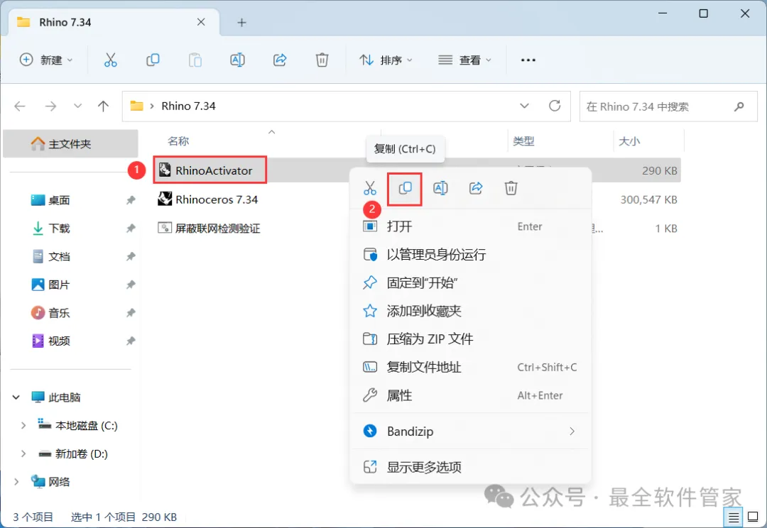 10、回到Rhino 7.34文件夹,找到【RhinoActivator】程序,再右键点击【复制按钮】