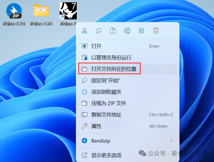 11、回到桌面,右键桌面上的【Rhino 7软件图标】,点击【打开文件所在的位置】