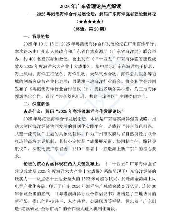 海洋不仅是高质量发展的战略要地,更是遴选考试中频频出现的重要命题方向。如何精准把握政策内涵?如何在考场上展现专业见解?这份《广东2025年理论热点解读第20期》为您系统梳理海洋强省建设的新路径,助您在考场上展现前瞻视野与专业深度🚀🚀🚀
