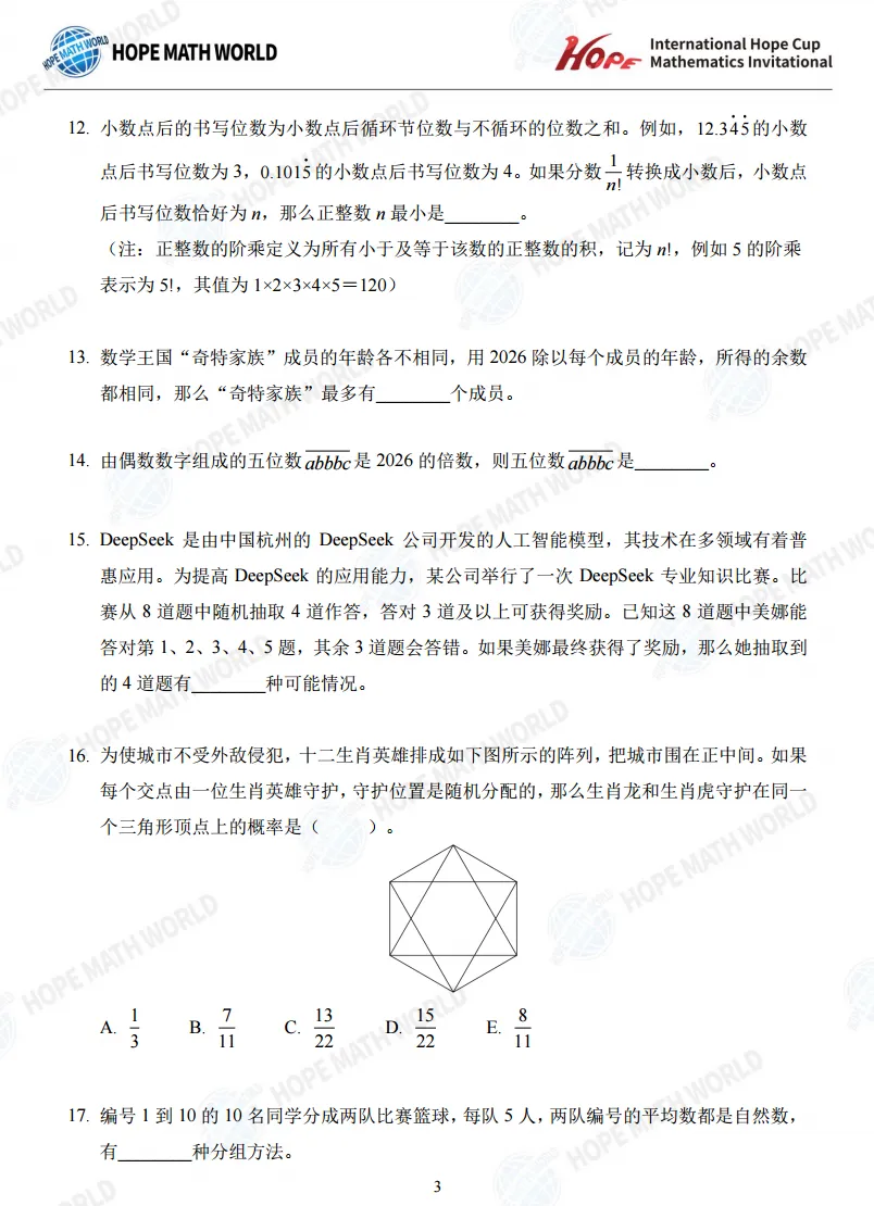 2026年冬季希望杯真题+答案免费下载,