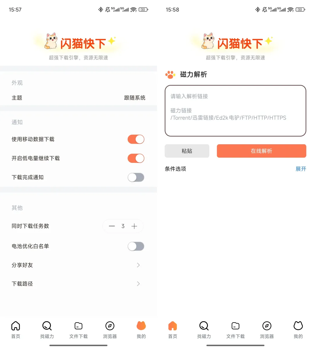 复制链接下载这个功能也很实用。平时在群里看到别人分享链接,或者自己在网页上找到资源,不用再跳转到其他 App,复制之后打开闪猫,它自己就会识别、自动解析。支持的链接类型还挺多的,像常见的那些下载协议基本都包含。