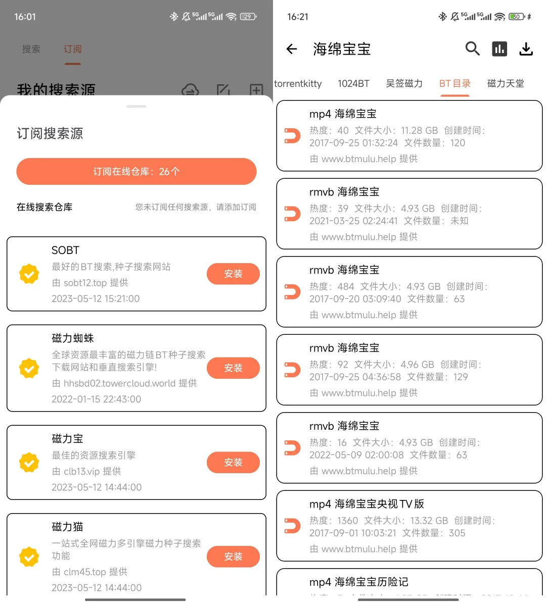 最让我觉得方便的是,它里面自带了二十几个搜索源,不用你一个个去找网站、记域名。订阅一下,想找什么资源,直接在里面搜就行,反应挺快的,不用等半天。